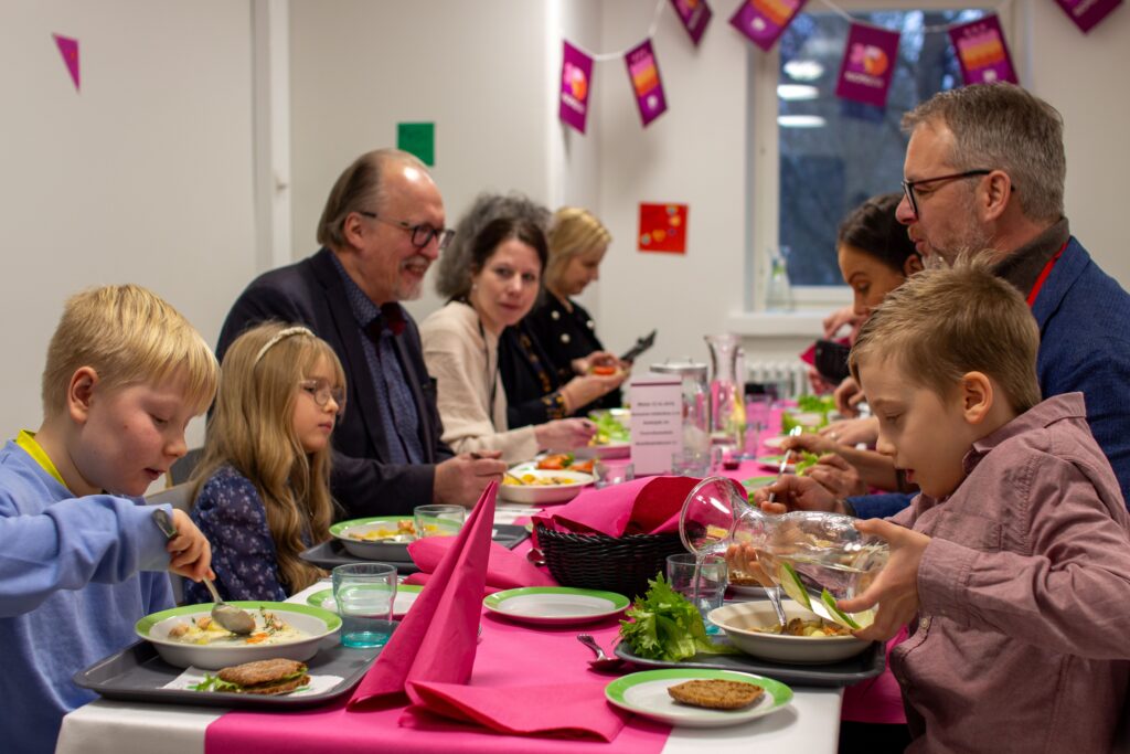 Oppilaskunnasta paikalla olivat Joel (3. luokka), Miitta (1. luokka) ja Ilja Ryynänen (4. luokka). Ruoka oli heidän mielestään hyvää ja tilaisuus oli juhlavampi kuin normaalilounas. He kertoivat, että koulupäiväkin oli erilainen ja he olivat katsoneet ennen lounasta Kuopio250-videon. Viikonloppuna he olivat käyneet katsomassa keskustan Välke-valotaideteoksia.