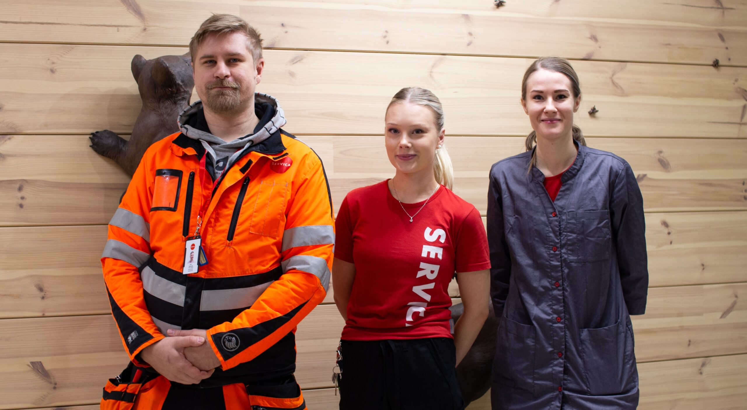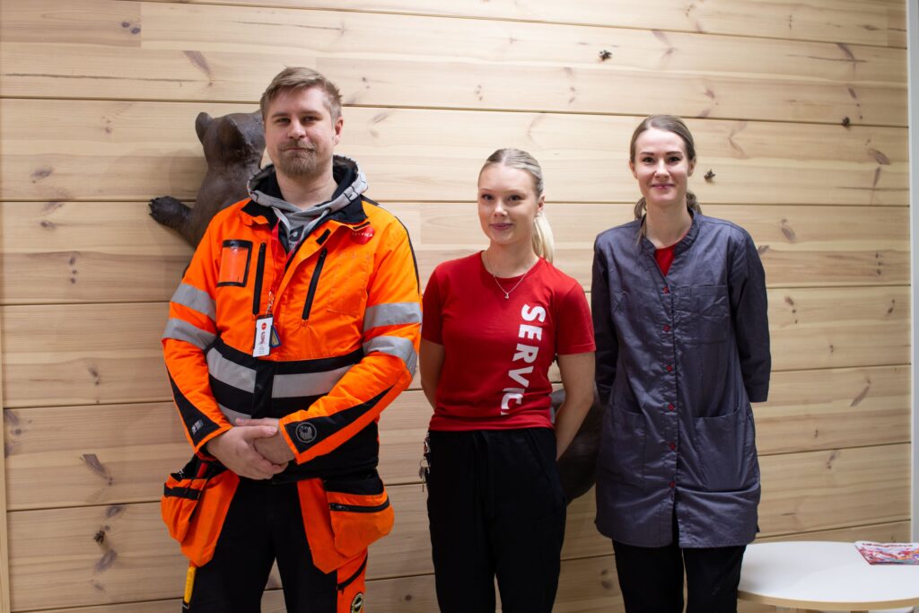 Kuvassa vasemmalta: kiinteistöhoidon Sami, laitoshuoltaja Nea ja palveluvastaava Taina.